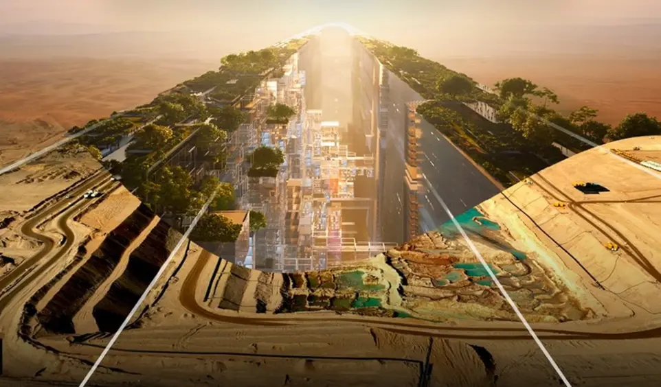 Futuristic Saudi mega-city with renewable energy, smart infrastructure, sustainable urban living projects.